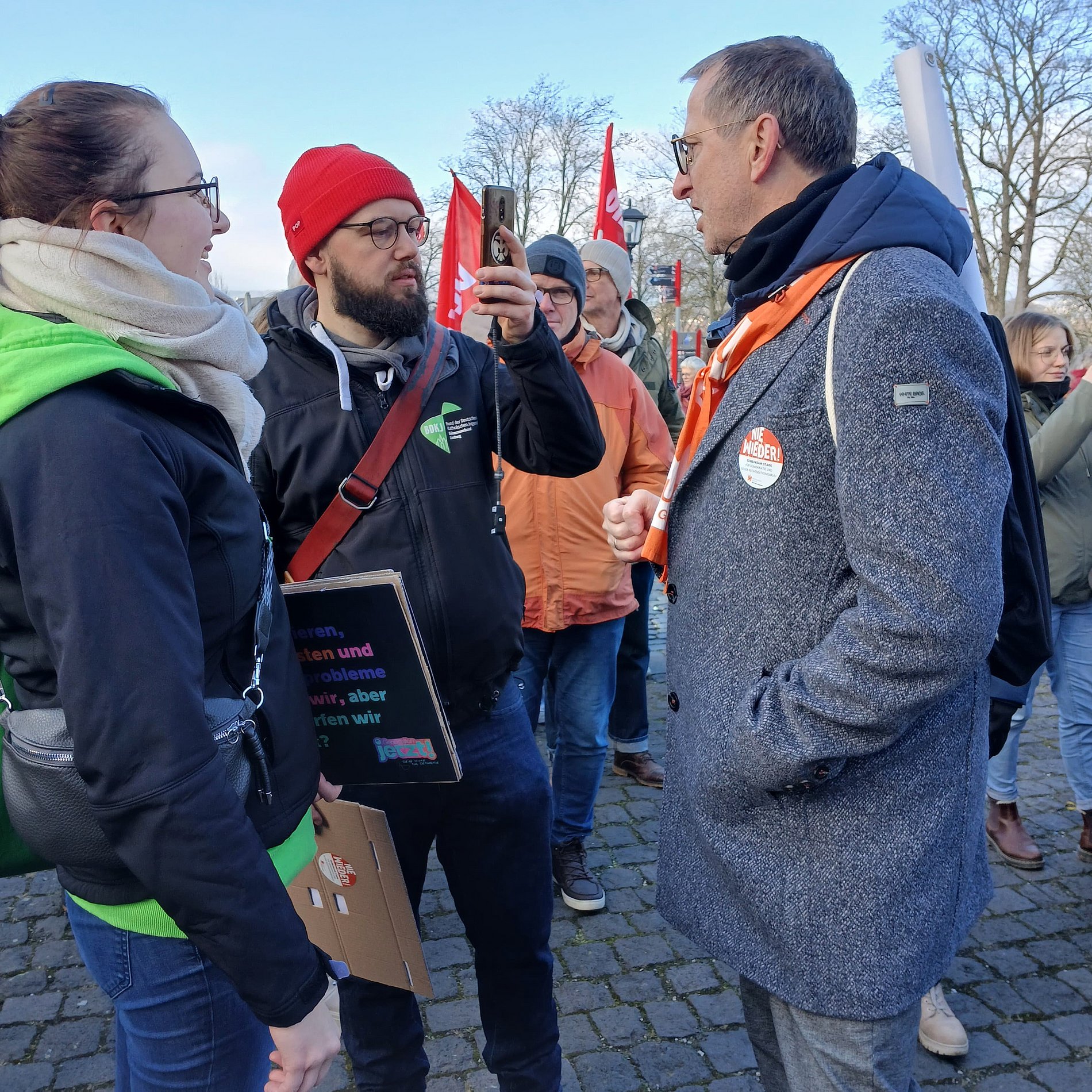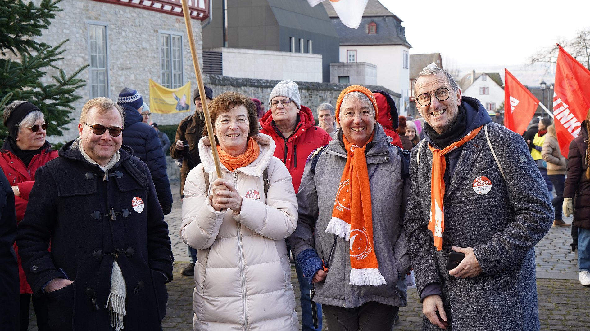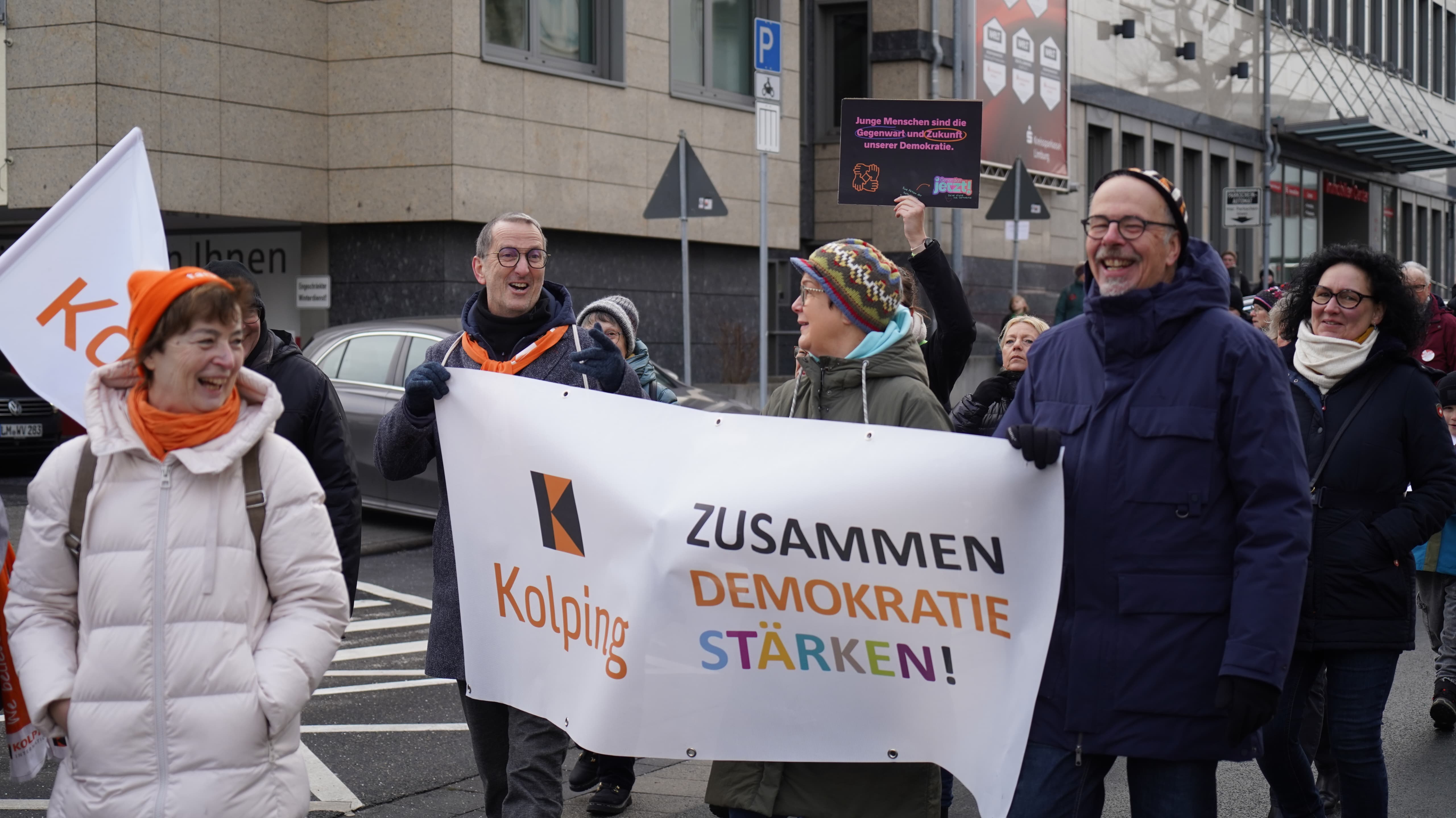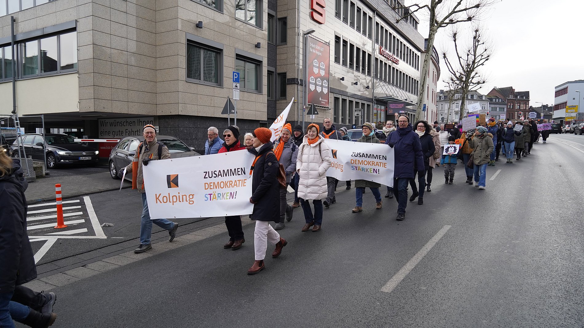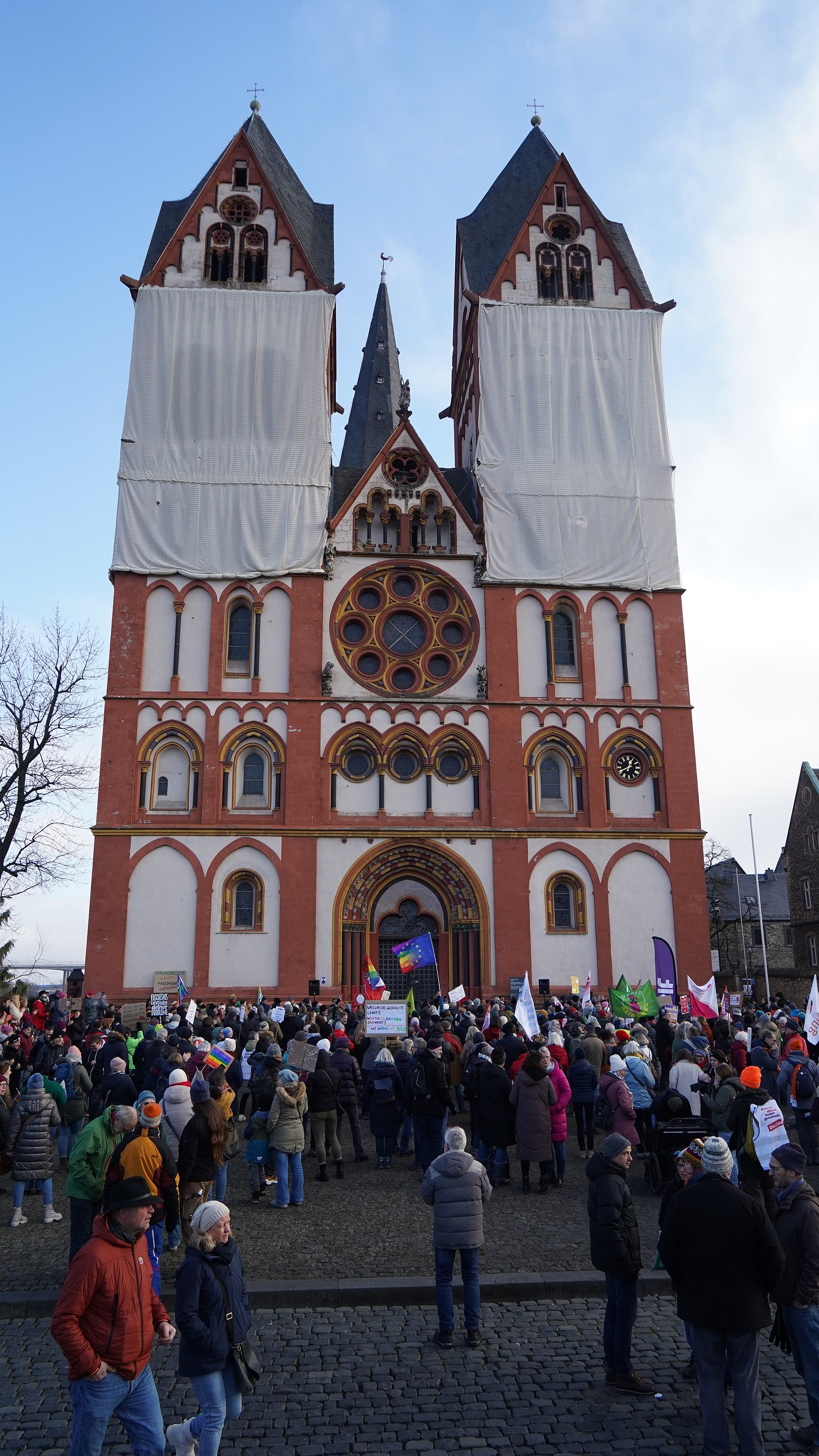 Limburg, 18.1.2025. - Heute haben wir mit anderen katholischen Verbänden die Demokratie-Demo in Limburg unterstützt. Wir halten zusammen, um gegen Fremdenhass, Intoleranz , Ausgrenzung und Faschismus anzutreten. Mit 1200 anderen Menschen sind wir durch die Limburger Strassen gezogen, um vor dem Dom zur Abschlusskundgebung gute Statements zur Stärkung unserer Demokratie zu hören. "Wir sind mehr!", sollten wir alle mit Deutlichkeit immer wieder zum Ausdruck bringen. Auch Bischof Georg Bätzing unterbrach seine Klausurtagung, um mit zu demonstrieren.